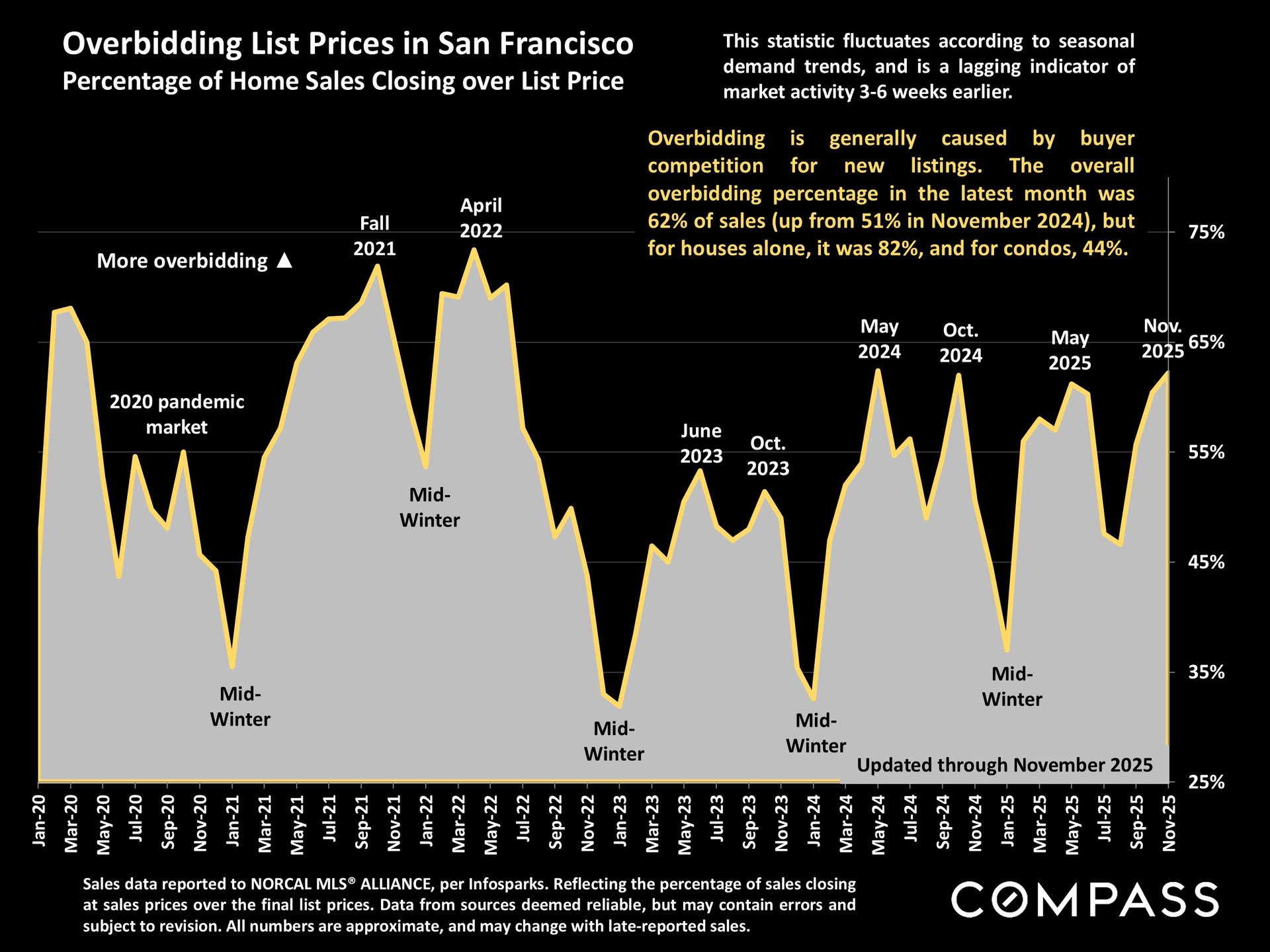 The real story this fall was the incredible strength of buyer demand. Virtually every key metric—prices, inventory, overbidding, and days on market—pointed to a market that heated up dramatically. Much of this momentum is being fueled by the fast-growing AI sector, which is bringing renewed energy, jobs, and buyers back into the city. As a result, San Francisco has once again become one of the most competitive real estate markets in the country.